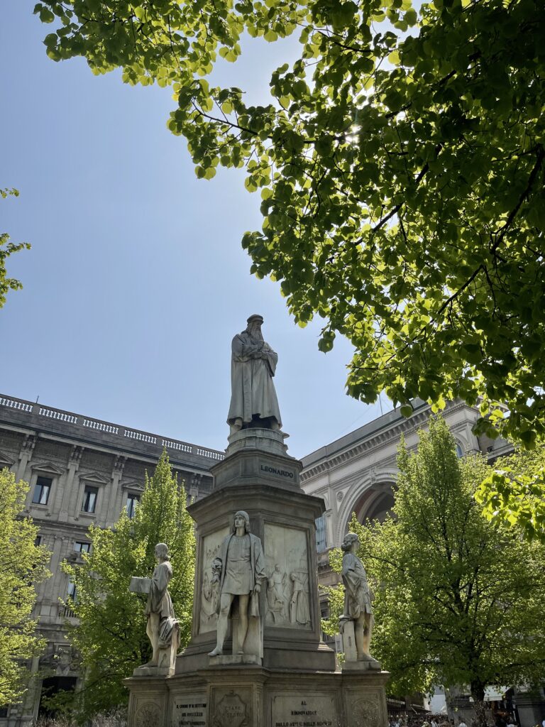 📍Piazza della scala: Monument to Leonardo da Vinci. A lively square surrounded by shopping and cafés.